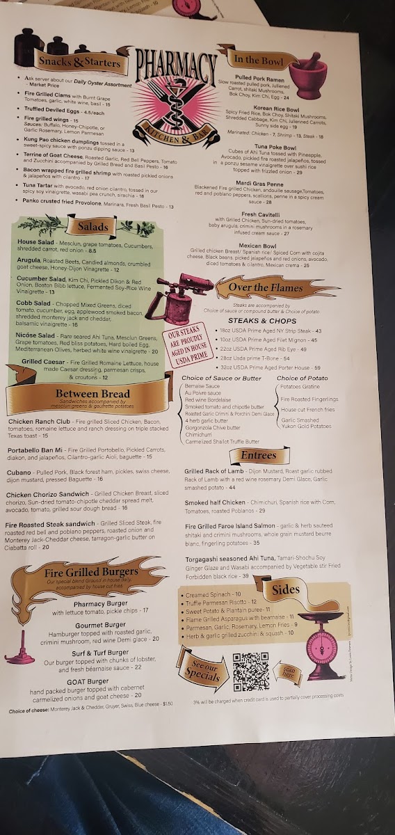 Pharmacy Kitchen & Bar, located at 62 W Main St, Goshen, NY, offers a diverse and enticing menu that blends classic comfort with innovative flavors. For those seeking a light bite or starter, the Oysters and Fire Grilled Clams are fresh and flavorful choices, while the Truffled Deviled Eggs and Smoked Fire Grilled Wings provide a savory twist to traditional favorites. The Terrine is an excellent option for those desiring a more refined starter.